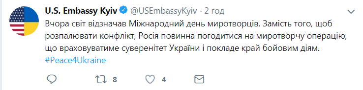 "Вчера мир отмечал Международный день миротворцев. Вместо того, чтобы разжигать конфликт, Россия должна согласиться на миротворческую операцию, которая будет учитывать суверенитет Украины и положит конец боевым действиям", - говорится в сообщении, опубликованном в официальном Твиттер-аккаунте посольства США в среду вечером 30 мая.