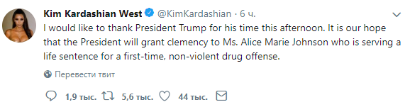 Позже Кардашьян в Twitter также поблагодарила американского президента за встречу.