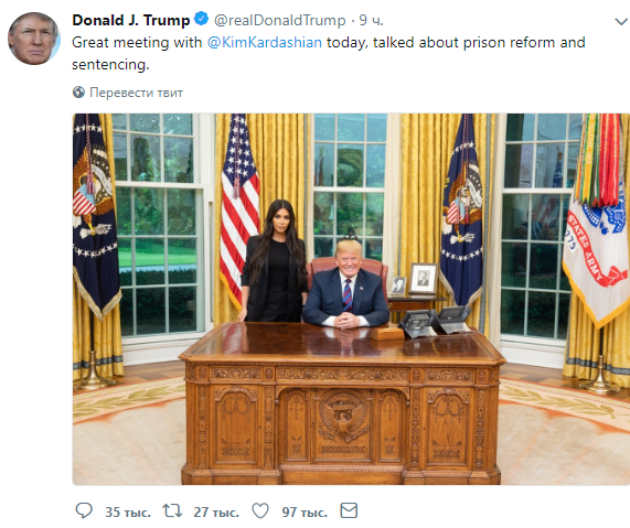 "Имел сегодня замечательную встречу с Ким Кардашян, говорили о реформе тюремной системы и вынесении наказания", - написал Трамп в Тwitter и добавил к сообщению совместное фото со звездой.