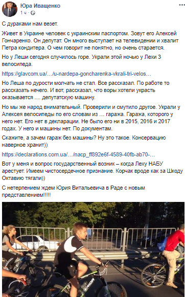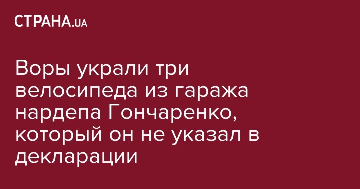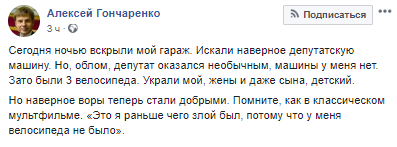 "Сегодня ночью вскрыли мой гараж. Искали наверное депутатскую машину. Но, облом, депутат оказался необычным, машины у меня нет. Зато были 3 велосипеда. Украли мой, жены и даже сына, детский", - пожаловался в соцсети Гончаренко и предположил, что теперь обчистившие его гараж воры, вероятно, подобрели.