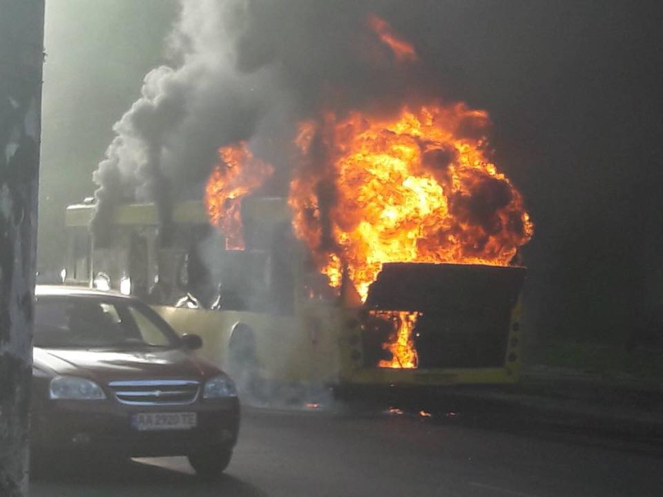 В Киеве на Дегтягевской загорелся рейсовый автобус, дым пожара видел издалека. Судя по фото, возгорание началось в моторном отсеке и охватило весь салон.