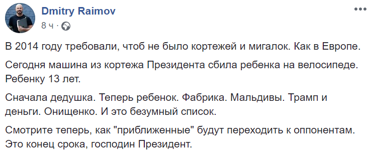 "АП отрицает, что авто президентского кортежа на большой скорости сбило ребенка на пешеходном переходе. Но на всякий случай на место аварии нагнали несколько сотен полицейских, а в интернет - ботов, которые, как и в случае со сбитым пенсионером, рассказывают, что ребенок был неправ. Люди реально не ведают, что творят?", - пишет в Facebook журналистка Татьяна Даниленко