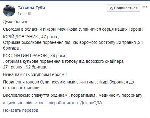 Двое военнослужащих, получившие ранения на Донбассе, умерли в Днепровской областной больнице имени Мечникова.