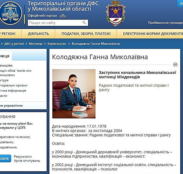 Как сообщало издание 368.media, Анна Колодяжная заняла пост замначальника Николаевской таможни летом 2014 года. Ее работа в таможенном ведомстве началась в 2004 году, когда она устроилась в Донбасскую региональную таможню, где сделала быструю карьеру. С февраля 2011 и по июль 2014 года Колодяжная работала заместителем (в том числе первым) главы Крымской таможни, а после этого была переведена в Николаев.