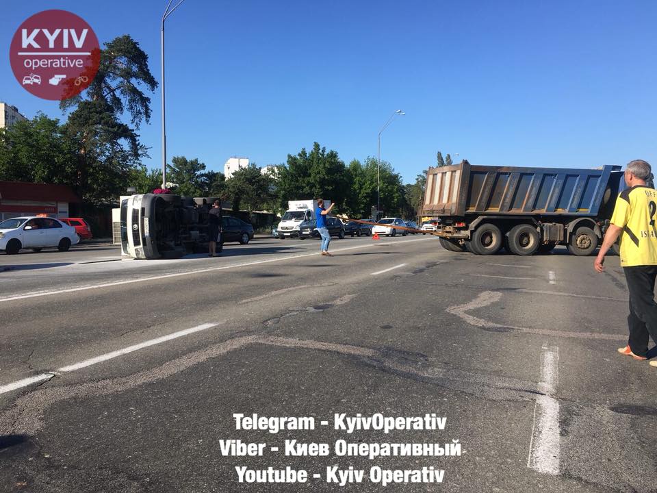 В Киеве на Броварском проспекте, возле АЗС KLO, перевернулся грузовик Volkswagen.
