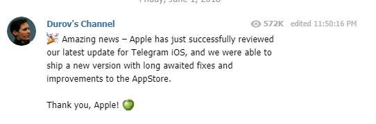 "Apple только что одобрила наше последнее обновление для Telegram iOS, и мы смогли отправить новую версию с долгожданными исправлениями и улучшениями в AppStore", - сказано в сообщении.