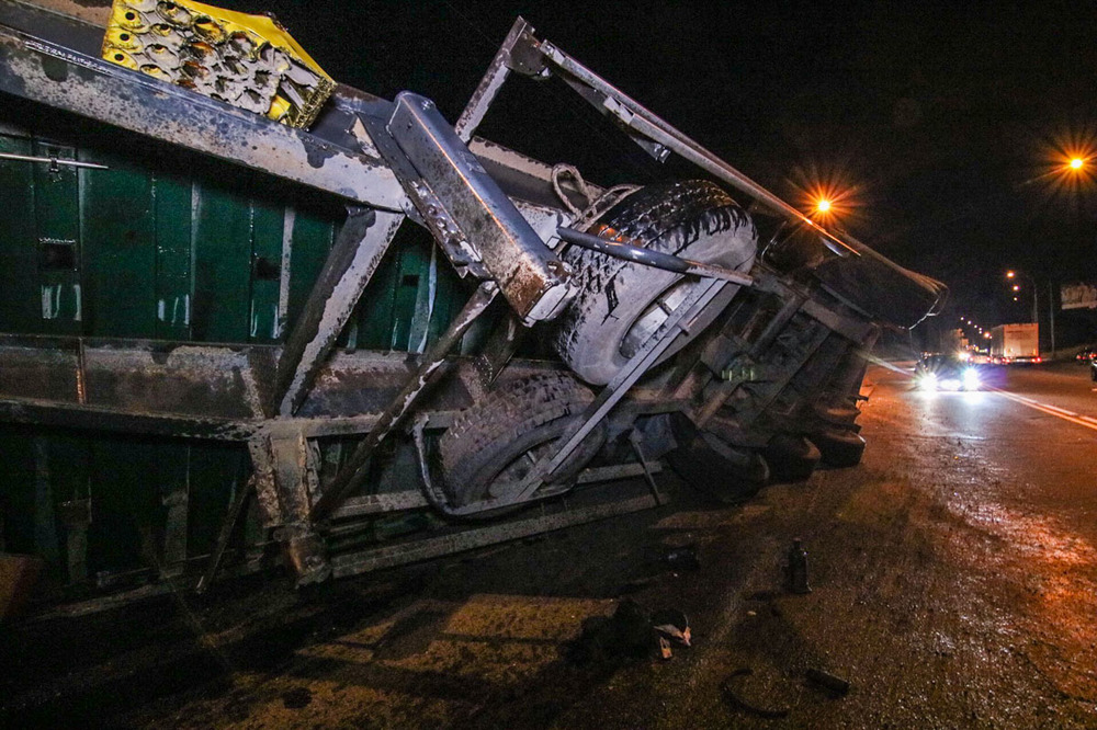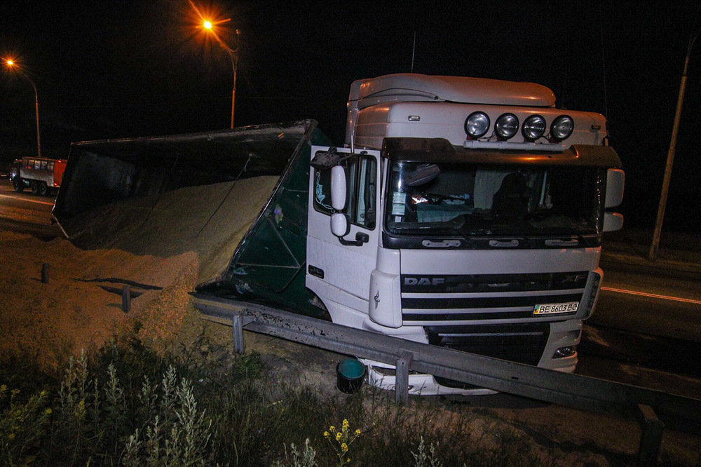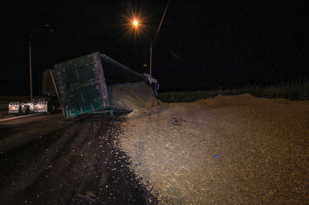 Как рассказал водитель фуры, машина двигалась по улице Заболотного в сторону Столичного шоссе. В полуприцепе-самосвале он вез корм для животных. Внезапно на ходу у фуры начал подниматься кузов, водитель не заметил этого и произошло опрокидывание.