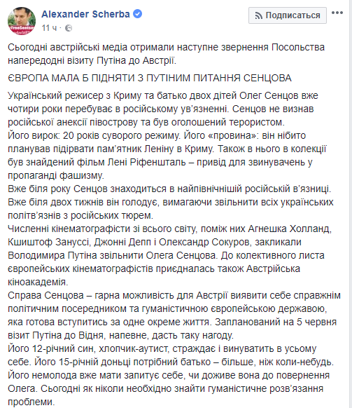 "Дело Сенцова - хорошая возможность для Австрии проявить себя настоящим политическим посредником и гуманистическим европейским государством, которая готова вступиться за одну отдельную жизнь. Планируемый на 5 июня визит Путина в Вену, наверняка, даст такую возможность", - сообщил он.