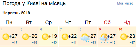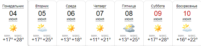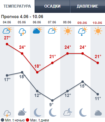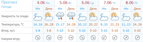 Ресурс Мeteoprog.ua обещает дождь во вторник и субботу, 5 июня - с грозой. В понедельник до +27. В среду и четверг похолодает до +18...+21. В пятницу и субботу прогнозируют до +24, а в воскресенье +21.