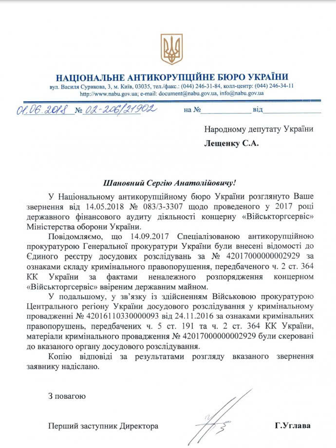 "14.09.2017 Специализированной антикоррупционной прокуратурой были внесены сведения в Единый реестр досудебных расследований по N 42017000000002929 по признакам состава уголовного преступления, предусмотренного ч. 2 ст. 364 (злоупотребление властью – Прим. Ред.) УК Украины по факту ненадлежащего распоряжения концерном "Военторгсервис" вверенным государственным имуществом", - говорится в ответе.