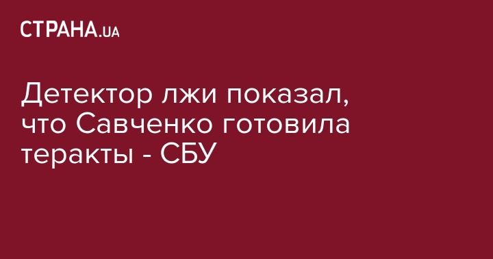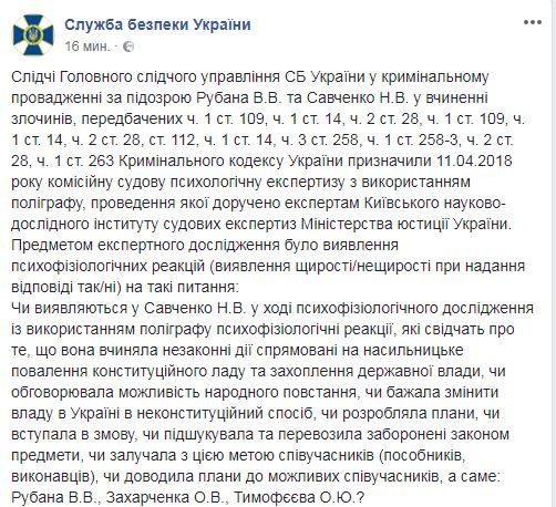 СБУ также утверждает, то полиграф показал, что "Надежда Савченко обсуждала планы вооруженного захвата власти и участвовала в подготовке вооруженного захвата власти, для чего с целью насильственного свержения конституционного строя и захвата государственной власти подыскивала и перевозила оружие". Все это на обсуждала с Владимиром Рубаном (главой "Офицерского корпуса" - Прим. Ред.), Александром Захарченко (главой "ДНР" - Прим. Ред.) и Александром Тимофеевым ("министром доходов и сборов ДНР" - Прим. Ред).