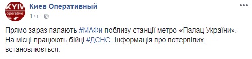 "Прямо сейчас горят МАФы возле станции метро "Палац Украина". На месте работают бойцы ГСЧС. Информация о пострадавших устанавливается", - говорится в сообщении.