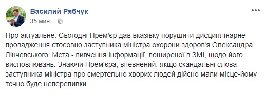 "Сегодня премьер дал указание возбудить дисциплинарное производство в отношении заместителя министра здравоохранения Александра Линчевского. Цель - изучение информации, распространенной в СМИ, относительно его высказываний", - написал Рябчук на своей странице в соцсети Facebook во вторник.