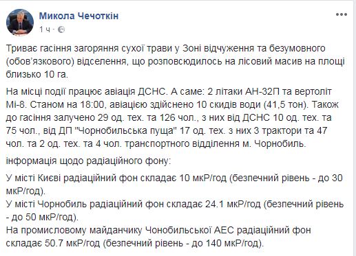 При этом он опубликовал информацию о радиационном фоне: "В Киеве радиационный фон составляет 10 мкР/ч (безопасный уровень - до 30 мкР/ч). В городе Чернобыль радиационный фон составляет 24.1 мкР/ч (безопасный уровень - до 50 мкР/ч). На промышленной площадке Чернобыльской АЭС радиационный фон составляет 50.7 мкР/ч (безопасный уровень - до 140 мкР/ч)".