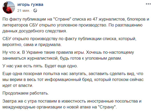 "По факту публикации на "Стране" списка из 47 журналистов, блогеров и литераторов СБУ открыло уголовное производство. По разглашению данных досудебного следствия.