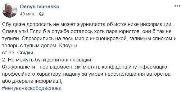 "СБУ даже допросить не может журналиста об источнике информации. Слава УПК! Если б в службе осталось хоть пара юристов, они б так не тупили. Опозорились на весь мир с инсценировкой, галимым списком и теперь с тупым делом. Клоуны.