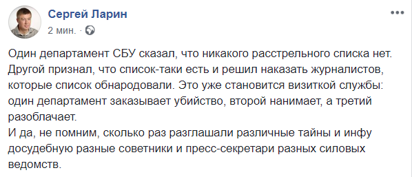 "Один департамент СБУ сказал, что никакого расстрельного списка нет. Другой признал, что список-таки есть и решил наказать журналистов, которые список обнародовали. Это уже становится визиткой службы: один департамент заказывает убийство, второй нанимает, а третий разоблачает.