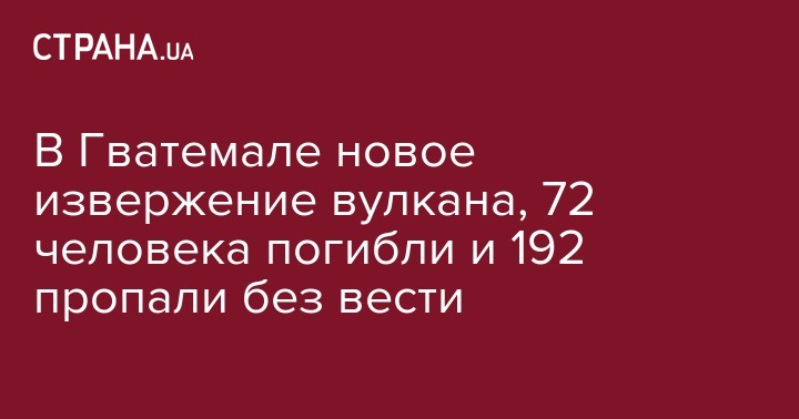 В Гватемале произошло новое извержение вулкана Фуэго. В результате количество погибших выросло до 72 человек. Пропавшими считаются 192 человека.