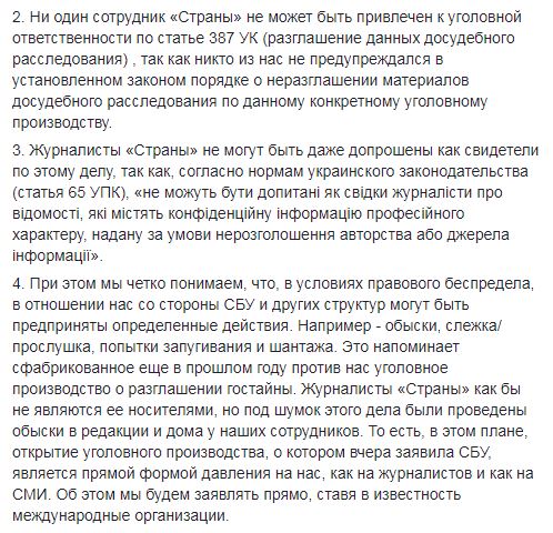 3. Журналисты "Страны" не могут быть даже допрошены как свидетели по этому делу, так как, согласно нормам украинского законодательства (статья 65 УПК), "не можуть бути допитані як свідки журналісти про відомості, які містять конфіденційну інформацію професійного характеру, надану за умови нерозголошення авторства або джерела інформації".