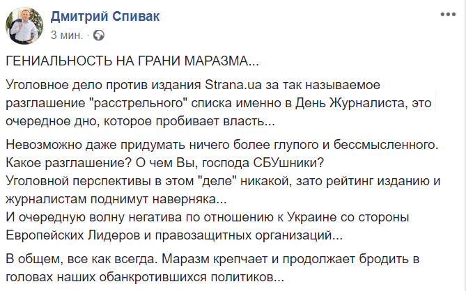 "Уголовное дело против издания Strana.ua за так называемое разглашение "расстрельного" списка именно в День Журналиста, это очередное дно, которое пробивает власть...