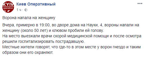 В Голосеевском районе Киева вороны напали на женщину, которой понадобилась госпитализация после инцидента.