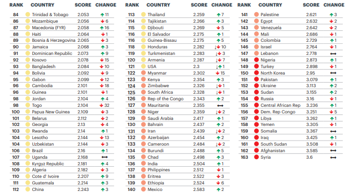 Менее миролюбивыми чем Украина странами в мире в рейтинге указаны Сирия, Афганистан, Южный Судан, Ирак, Сомали, Йемен, Ливия, Демократическая республика Конго, ЦАР и Россия.
