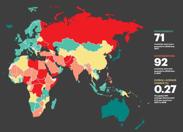 В целом в 92 странах ситуация с миролюбием, по сравнению с 2017 годом, ухудшилась, в 71 стране - улучшилась. Наименее мирными регионами мира являются Ближний Восток и Северная Африка