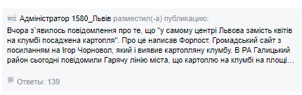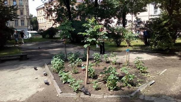 В центре Львова на клумбе на площади Старый Рынок неизвестные высадили картошку. Об этом сообщили в райадминистрации Галицкого района в Facebook.