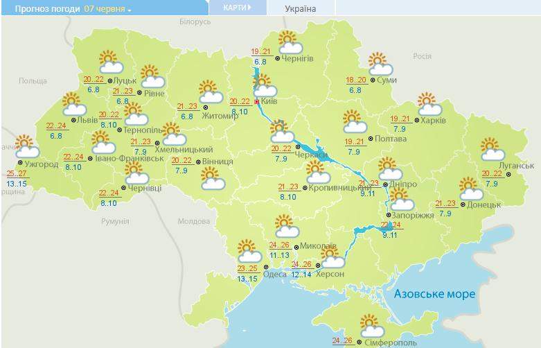 В четверг, 7 июня, синоптики обещают погоду без осадков во всех регионах. Днем от +20 до +23. На Юге и Закарпатье до +26...+27.