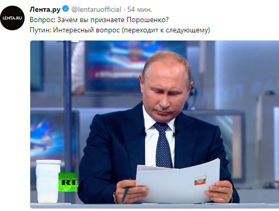 В частности, Путина спросили, зачем он "признает" украинского президента Порошенко. Путин произнес: "Очень интересный вопрос", но не стал на него отвечать и сразу перешел к следующему вопросу.