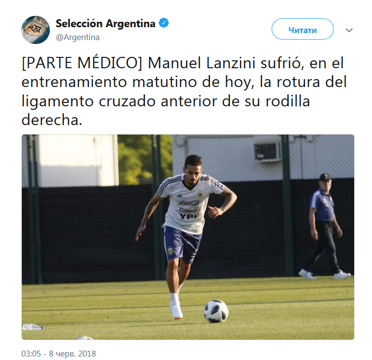 Мануль Лансини получил травму правой ноги и прошел медицинское обследование. Врачи диагностировали у него разрыв передней крестообразной связки колена. Таким образом, с большой вероятностью Лансини также пропустит и начало сезона-2018/19. Кто заменит игрока в сборной Аргентины пока неизвестно.