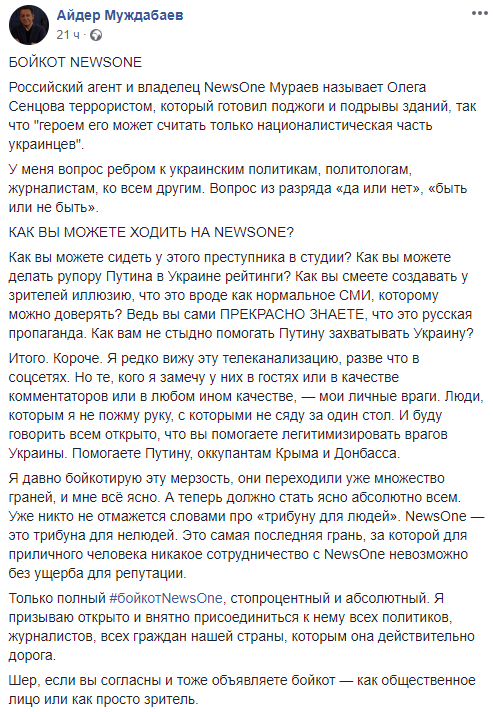 "Только полный #бойкотNewsOne, стопроцентный и абсолютный. Я призываю открыто и внятно присоединиться к нему всех политиков, журналистов, всех граждан нашей страны, которым она действительно дорога", – резюмировал Муждабаев.