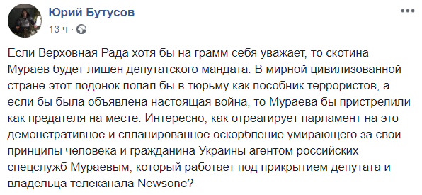 "Если Верховная Рада хотя бы на грамм себя уважает, то скотина Мураев будет лишен депутатского мандата. В мирной цивилизованной стране этот подонок попал бы в тюрьму как пособник террористов, а если бы была объявлена настоящая война, то Мураева бы пристрелили как предателя на месте. Интересно, как отреагирует парламент на это демонстративное и спланированное оскорбление умирающего за свои принципы человека и гражданина Украины агентом российских спецслужб Мураевым, который работает под прикрытием депутата и владельца телеканала NewsОne?".