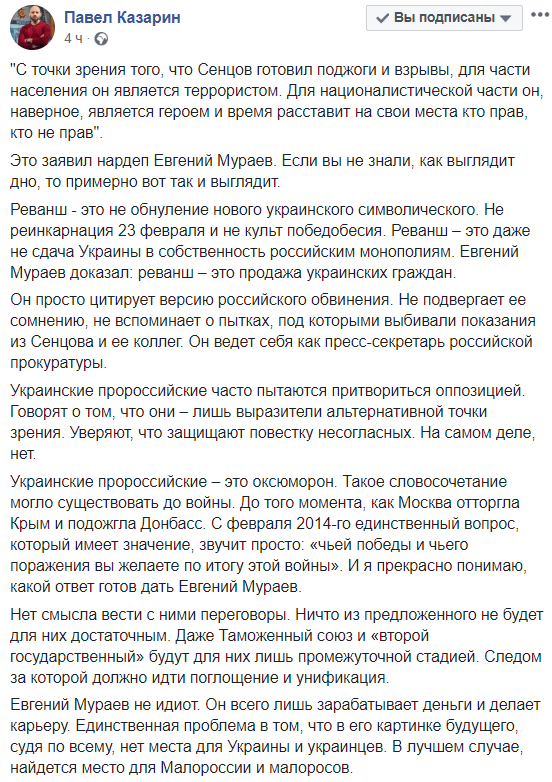 "Корежит их всех ведь не от слов Мураева "для кого-то Сенцов террорист, для кого-то – герой, время расставит все на свои места". Так прекрасно их выворачивает наизнанку от показаний Афанасьева и следующего из них вывода о том, что Сенцова они сами же и сдали намеренно, чтобы иметь в застенках Кремля неосвобождаемого (с надеждой ведь лажа вышла) узника, которым можно бесконечно мобилизовать свой оставшийся электорат. А тут снова как-то наперекосяк".