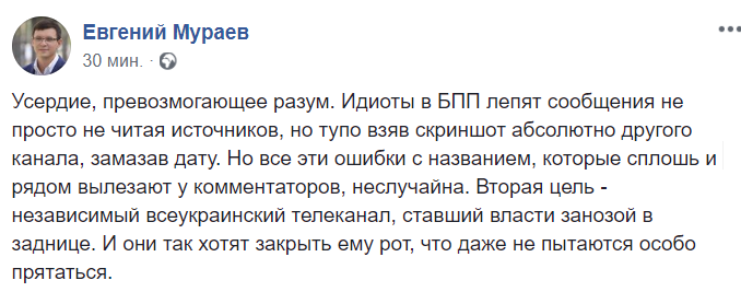 "Усердие, превозмогающее разум. Идиоты в БПП лепят сообщения, не просто не читая источников, но тупо взяв скриншот абсолютно другого канала, замазав дату. Но все эти ошибки с названием, которые сплошь и рядом вылезают у комментаторов, неслучайны. Вторая цель – независимый всеукраинский телеканал, ставший власти занозой в заднице. И они так хотят закрыть ему рот, что даже не пытаются особо прятаться".