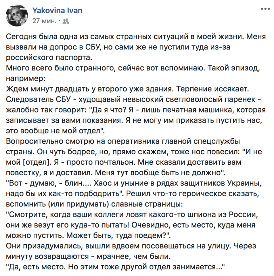 "Сегодня была одна из самых странных ситуаций в моей жизни. Меня вызвали на допрос в СБУ, но сами же не пустили туда из-за российского паспорта. Много всего было странного, сейчас вот вспоминаю.