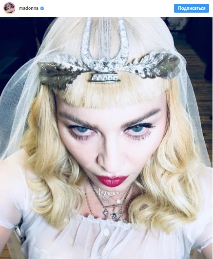Мадонна, которая закрутила роман с парнем, младше ее на 27 лет, выложила в свой микроблог снимок, на котором она изображена в необычной диадеме, фате и, вероятно, белом свадебном платье.