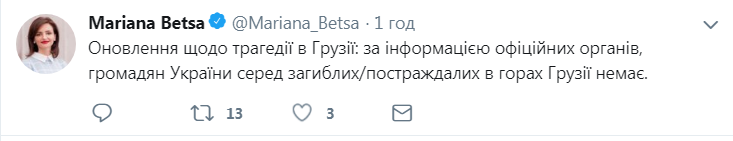 "Обновление по трагедии в Грузии: по информации официальных органов, граждан Украины среди погибших/пострадавших в горах Грузии нет", - указано в опубликованном сообщении.