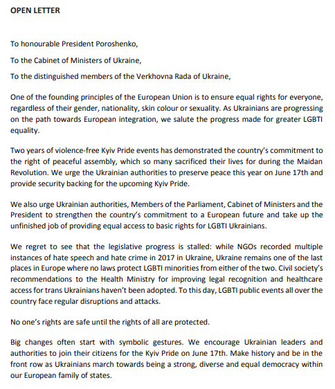 "Права человека не защищены, пока права всех не защищены. Большие изменения часто начинаются с символических жестов. Мы призываем украинских лидеров и власть присоединиться к своим гражданам на КиевПрайде 17 июня. Сделайте исторический шаг и будьте в первом ряду в то время, как украинцы идут навстречу сильной, разнообразной и равноправной демократии в нашей европейской семье", - отмечается в письме.