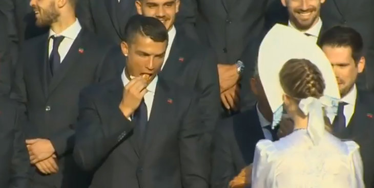 Здесь Роналду и компанию ждала торжественная встреча, передает Sports. Сборную Португалии угостили караваем. Одним из первых его попробовал нападающий Реала Криштиану Роналду. Он хотя и сидит на строгой диете, но тут пришлось уступить организаторам и съесть кусочек.