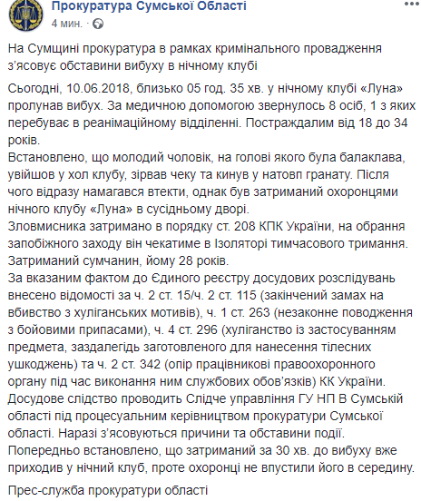 В прокуратуре рассказали подробности сегодняшнего взрыва в ночном клубе Сум.