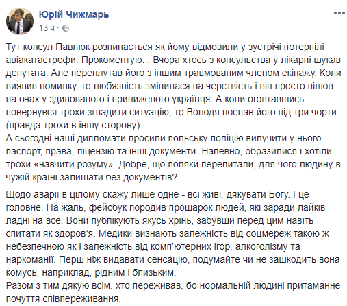 "Здесь консул Павлюк распинается как ему отказали во встрече пострадавшие авиакатастрофы. Прокомментирую ... Вчера кто-то из консульства в больнице искал депутата. Но перепутал его с другим травмированным членом экипажа. Когда обнаружил ошибку, то любезность сменилась на черствость и он просто ушел на глазах у изумленного и униженного украинца. А когда придя в себя вернулся немного сгладить ситуацию, то Володя послал его к черту (правда немного в другую сторону). А сегодня наши дипломаты просили польскую полицию изъять у него паспорт, права, лицензию и другие документы. Наверное, обиделись и хотели немного научить уму. Хорошо, что поляки спросили, для чего человека в чужой стране оставлять без документов?" - заявил Чижмарь.