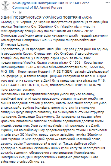 "11 июня, в Украину возвращается делегация и авиационная техника Воздушных Сил Вооруженных Сил Украины после участия в Международном авиационном показе Danish Air Show – 2018", - говорится в сообщении.