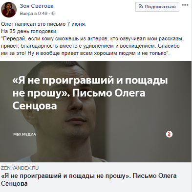 Российская правозащитница Зоя Светова опубликовала письмо украинского политзаключенного, кинорежиссера Олега Сенцова, который голодает в тюрьме уже 29 день.
