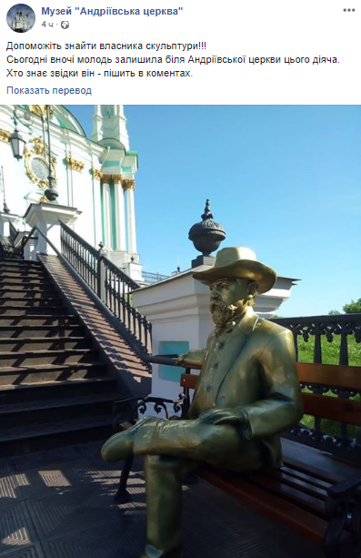 В ночь на понедельник, 11 июня, под Андреевской церковью в Киеве появилась статуя солидного мужчины в шляпе. Об этом на своей странице в Facebook сообщил музей "Андреевская церковь".