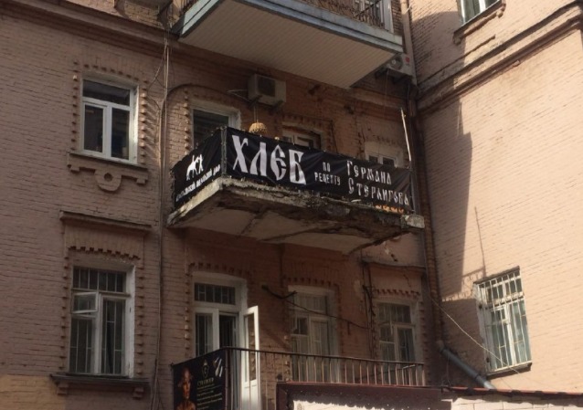 На фото видно, что на балконе одного из домов вывешен рекламный баннер "Хлеб по рецепту Германа Стерлигова".