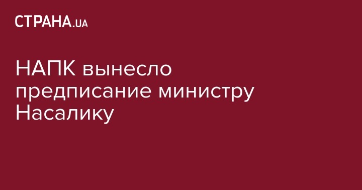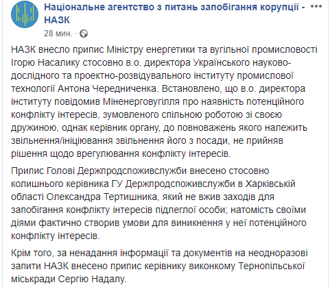 НАПК вынесло предписание Министру энергетики и угольной промышленности Игорю Насалику.