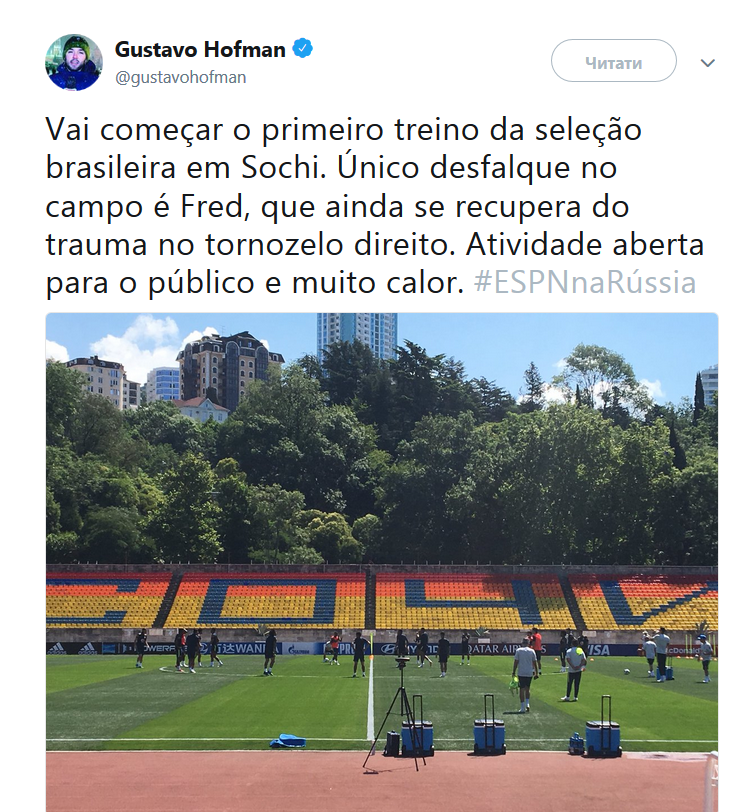 "Начинается первая тренировка бразильской команды в Сочи. Только на поле не все - нет Фреда, который все еще восстанавливается от травмы правой лодыжки", - написал Густаво Хофман.