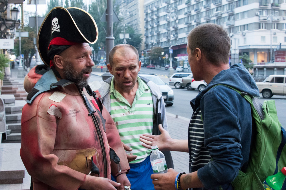 После короткого диалога c "пиратом" стало известно, что "элитный бомж города Киев" направляется на "Палац спирта" (официальное название станции киевского метро - "Дворец спорта") для принятия утренних водных процедур, ведь гидрокостюм теплый, а ночь была жаркая. Прогулявшись по улице в сторону фонтана, мужчине удалось накопить немного денег, ему даже дали один доллар.