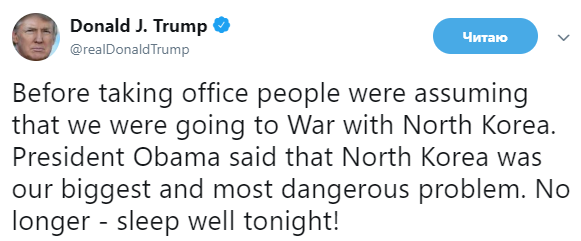 "До прихода к власти люди предполагали, что мы будем воевать с Северной Кореей. Президент Обама говорил, что Северная Корея является нашей самой большой и самой опасной проблемой. Больше это не так - спите спокойно по ночам!" - написал Дональд Трамп в соцсети.
